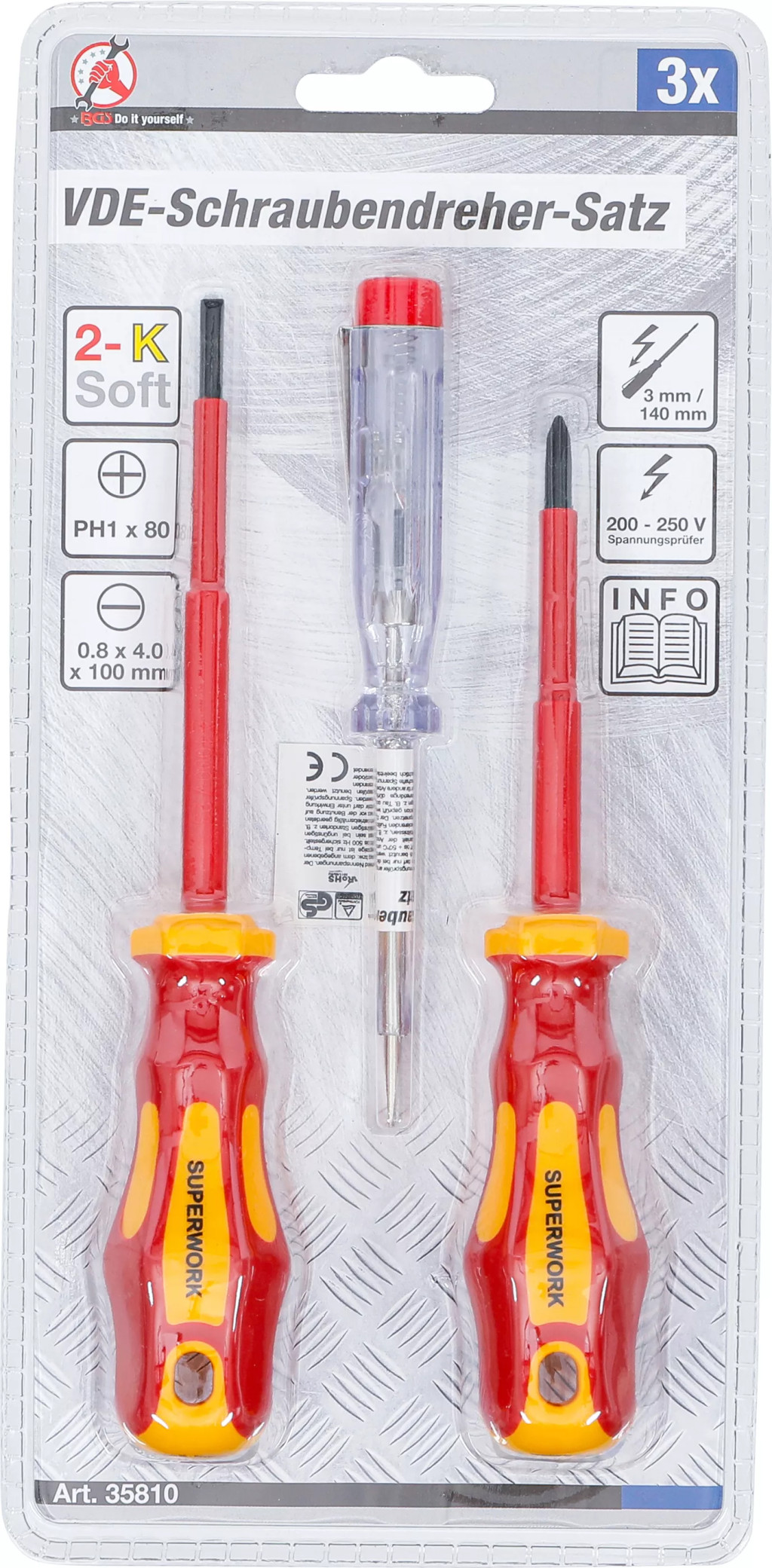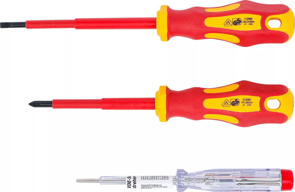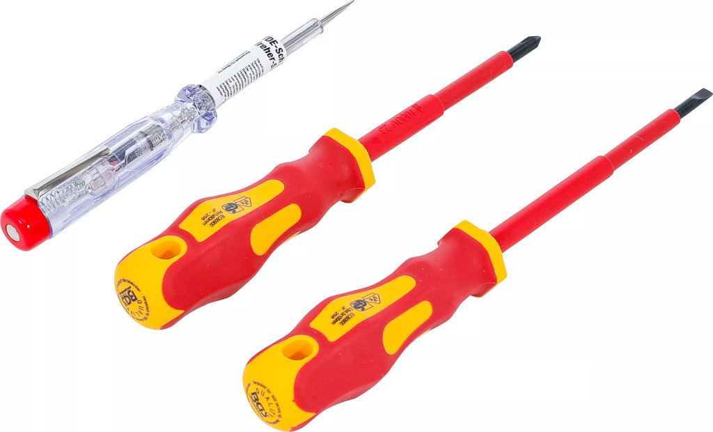 Obsah balenia:1× VDE skrutkovač PH1, 80 mm dĺžka čepele1× VDE skrutkovač plochý 4 mm, 100 mm dĺžka čepele, magnetický hrot1× skúšačka napätia, 200 – 250 V, 140 mm dĺžka
