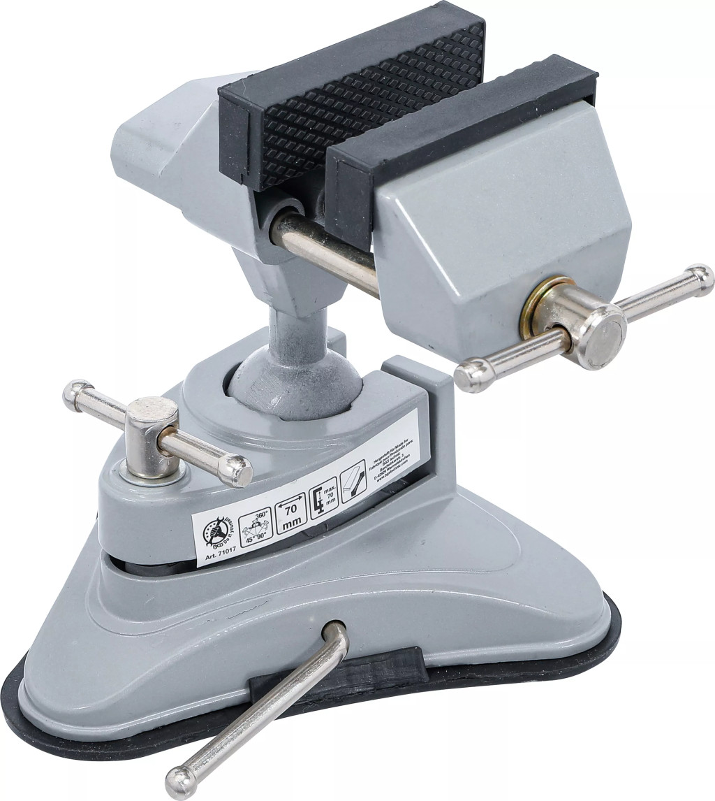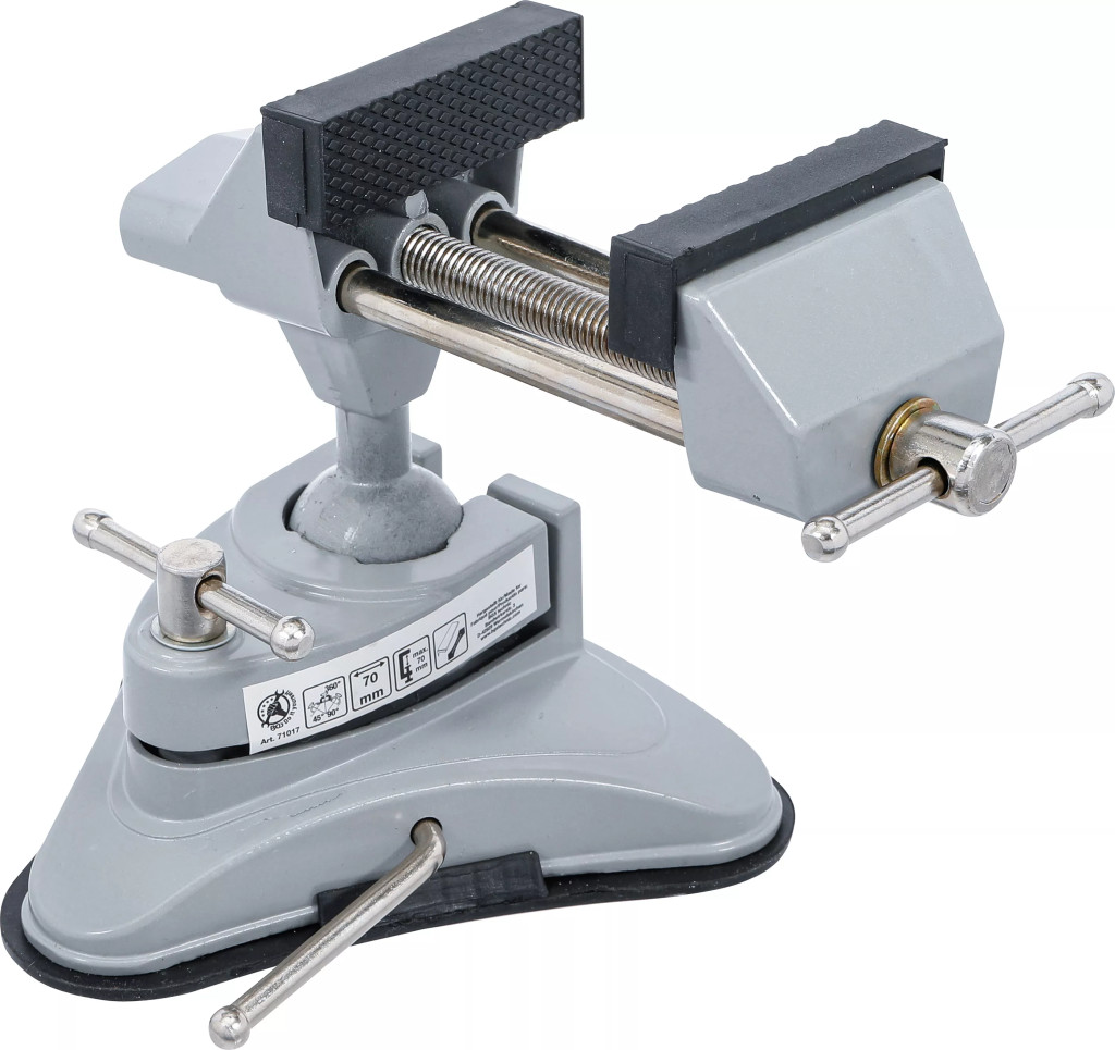 Vákuový zverák s guľovým kĺbom.Praktický a všestranne použiteľný zverák vybavený vákuovou prísavkou, ktorá umožňuje rýchle a spoľahlivé pripevnenie na hladké povrchy. Ideálny najmä do obmedzených priestorov v laboratóriách, ako aj na menšie mechanické a remeselné práce či opravy.
