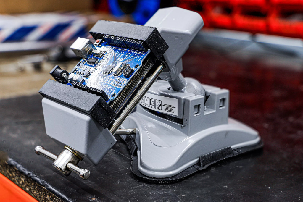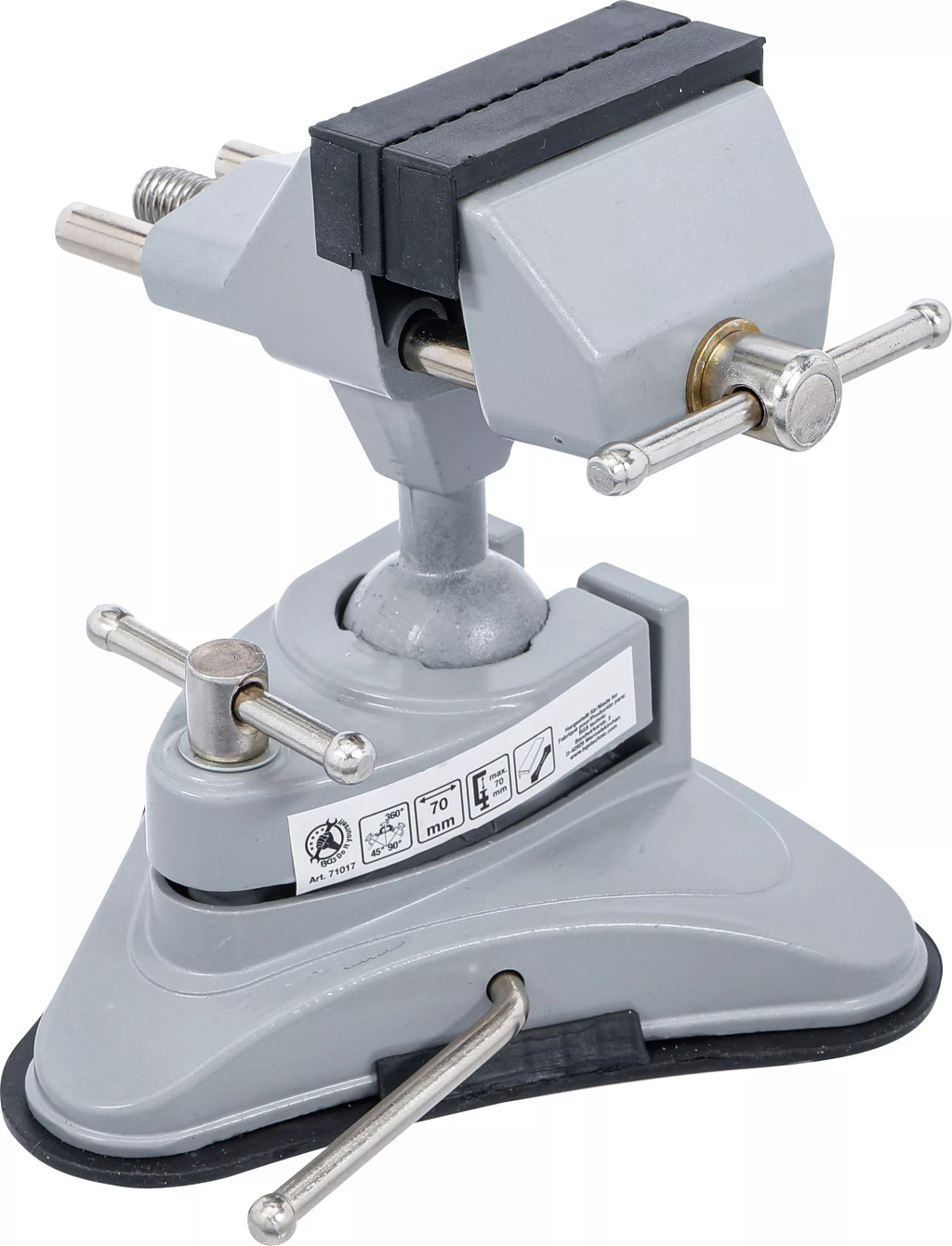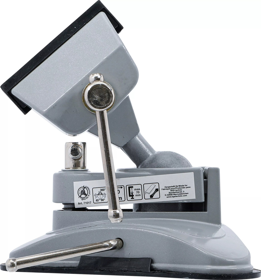 Hlavné vlastnosti:Vákuová prísavka pre okamžité upevnenieGuľový kĺb umožňuje nastaviteľnosť až 360° horizontálne a 180° vertikálneOdnímateľné gumové ochranné čeľuste chránia súčiastky pred poškodenímRobustné prevedenie z hliníkového odliatkuMaximálny otvárací rozsah: 70 mm.