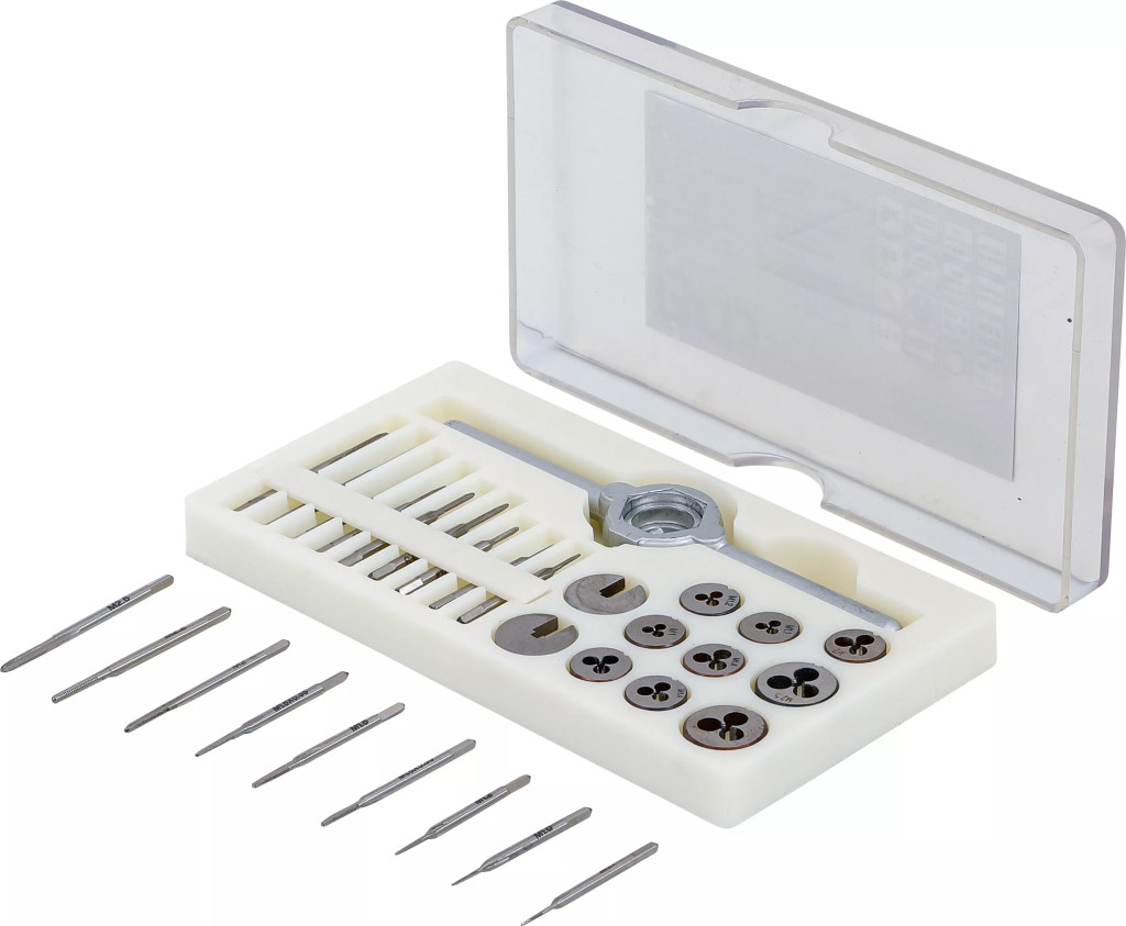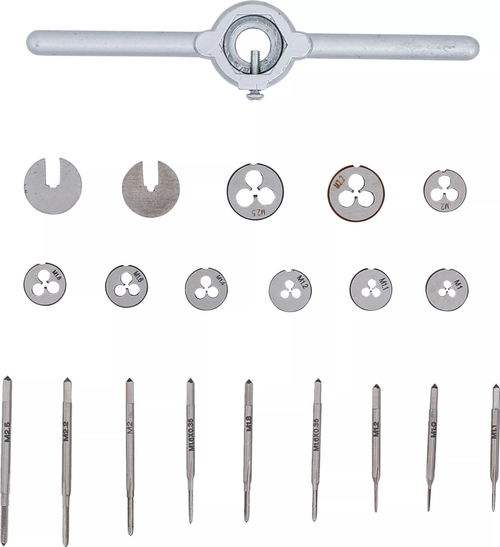 Rozsah dodávky:1 držiak závitorezných matríc / kľúč na závit1 redukčný krúžok pre matrice M1,0 - M2,01 adaptér pre kohútiky M1.0 - M1.81 adaptér pre kohútiky M2.0 - M2.59 závitníkov (predrezačov)9 závitníkov (dokončovacie frézy)9 zomrie.