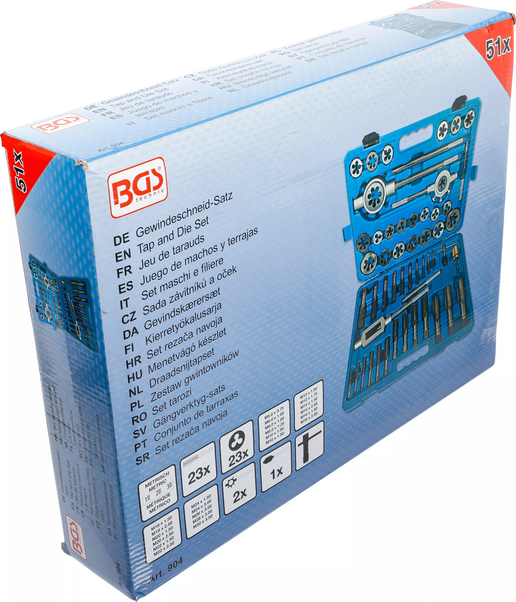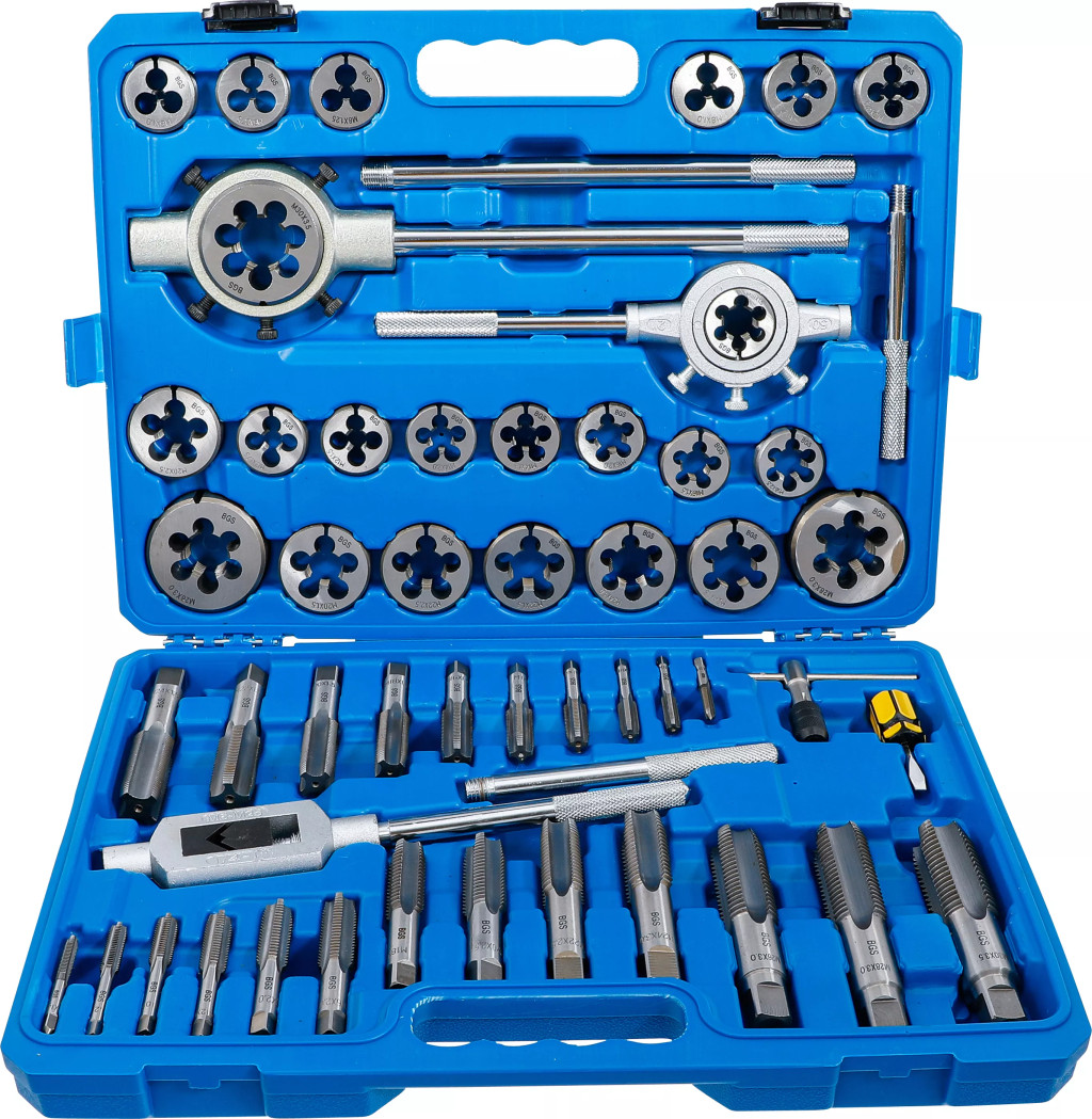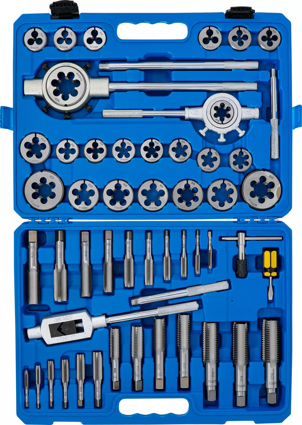 Rozsah dodávky:23 závitníkov a 23 závitníkov, M6 x 1,0, M6 x 0,75, M8 x 1,25, M8 x 1,0, M10 x 1,5, M10 x 1,25, M12 x 1,75, M12 x 1,5, M14 x 2,0, M14 x 1,5, M16 x 2,0, M16 x 1,5, M18 x 2,5, M18 x 1,5, M20 x 2,5, M20 x 1,5, M22 x 2,5, M22 x 1,5, M24 x 3,0, M24 x 1,5, M26 x 3,0, M28 x 3,0, M30 x 3,51 závitník | M6 - M301 držiak nástrojov s posuvnou rukoväťou pre závitníky | M6 - M8 | 70 mm2 držiaky matríc, 65 x 25 mm a 50 x 16 mm (vrátane adaptéra 38 x 13 mm)1 skrutkovač, plochý SL 6 mm.