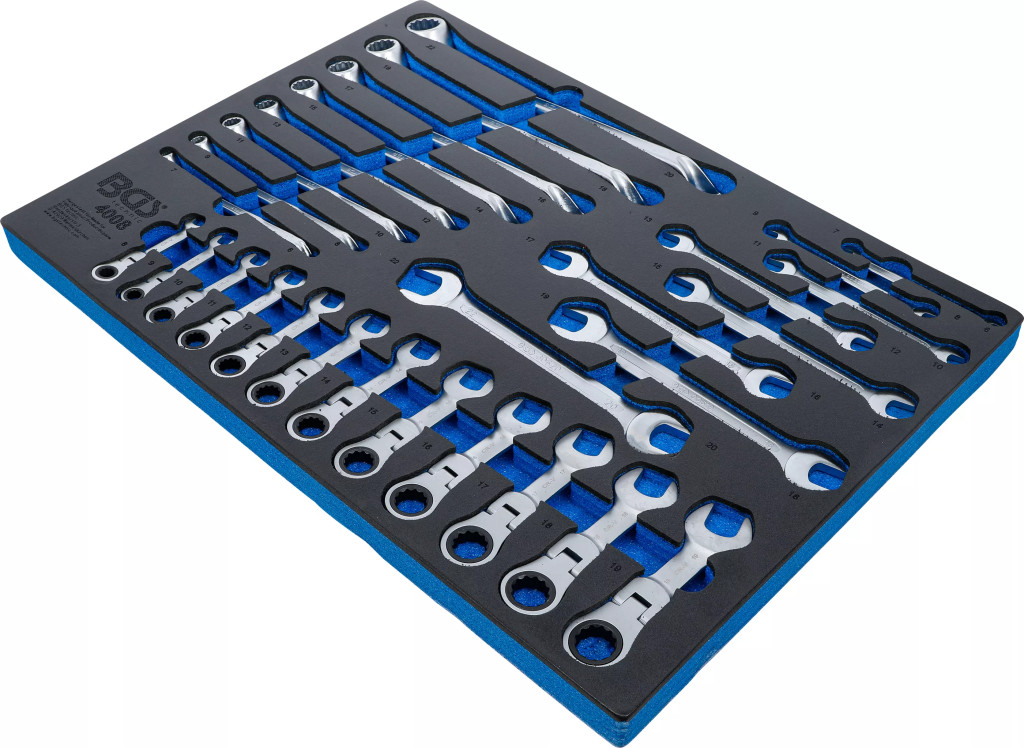 Technické údaje:Obsahuje kompletnú sadu otvorených, očkových a račních kombinovaných kľúčov v najpoužívanejších veľkostiachRačňové kľúče: extra krátke, uhlové vyhotovenieJemný 72-zubový mechanizmus pre efektívnu prácu aj v úzkych priestorochVložka z robustnej tvrdej peny pre bezpečné a prehľadné uloženieKompatibilná so všetkými dielenskými vozíkmi BGSRozsah dodávky:8× obojstranný očkový kľúč (hlboký, odhnutý):SW 6 × 7 mmSW 8 × 9 mmSW 10 × 11 mmSW 12 × 13 mmSW 14 × 15 mmSW 16 × 17 mmSW 18 × 19 mmSW 20 × 22 mm8× obojstranný otvorený kľúč:SW 6 × 7 mmSW 8 × 9 mmSW 10 × 11 mmSW 12 × 13 mmSW 14 × 15 mmSW 16 × 17 mmSW 18 × 19 mmSW 20 × 22 mm