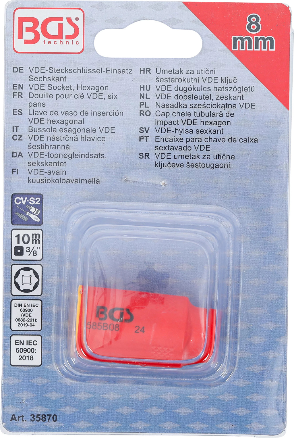 Technické údaje:Typ: VDE zásuvkaProfil: šesťhranný (Hexagon)Veľkosť kľúča: 8 mmPohon: 10 mm (3/8")Izolácia: VDE, do 1000 V ACNormy: EN 60900 / IEC 60900Katalógové číslo: 35870.