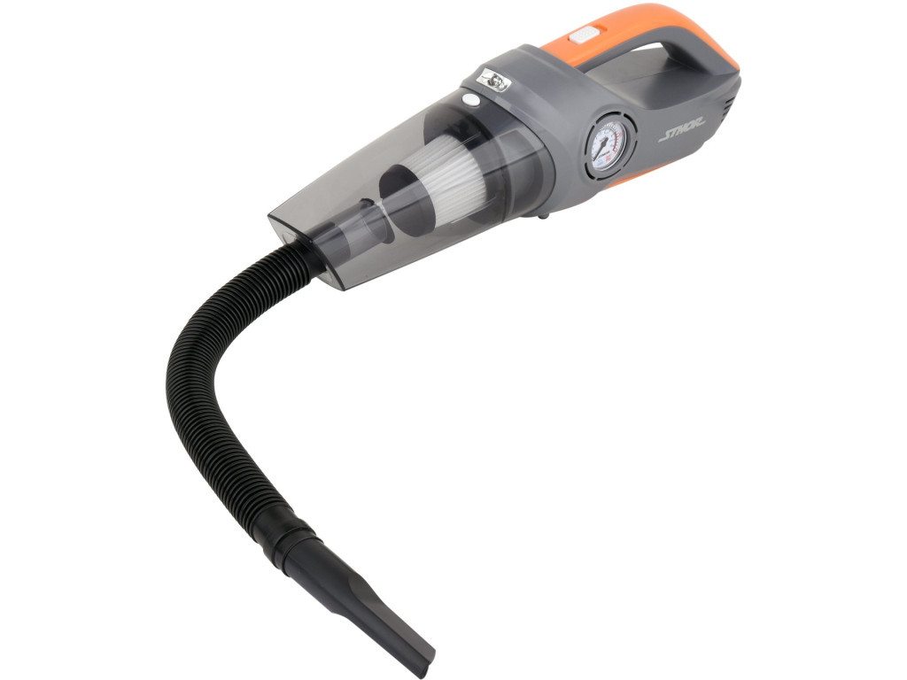 Hlavné vlastnosti:VysávačPríkon: 80 WTyp vysávania: suché aj mokréCyklónový, bezvreckový systém – vysoká účinnosť vysávaniaPodtlak: 3,5 kPaNapájanie: 12 V z autozásuvkyFilter: umývateľný HEPADĺžka napájacieho kábla: 4,2 m – dosiahne do celého interiéruLED osvetlenie – uľahčuje prácu po zotmeníOchranná gumová klapka, ktorá zabraňuje vypadávaniu nečistôtPena proti poškriabaniu na spodnej strane vysávačaKompresorVýkon kompresora: 120 WMaximálny tlak: 1 MPa / 150 PSI (10,3 bar)Prietok vzduchu: 20 l/minPU hadica: 1 mManometer: áno – pre presnú kontrolu tlakuLED svetlo: áno – používanie aj v tmeVhodný na nafukovanie pneumatík, lôpt, matracov a pod.Technické parametre:Značka: STHORSéria: GRFRod: cyklónový, bezvreckovýTyp práce: suché / mokréNapätie: 12 V DCMaximálny tlak kompresora: 1 MPaMateriál hadice: PUDĺžka flexibilnej hadice vysávača: 0,39 mVeľkosť valca: 19 mmPoistka: 6×30 mm, 250 V / 15 ATrieda izolácie: IIIHmotnosť: 1,18 kgSymbol produktu: 82953Obsah balenia:Vysávač s kompresoromOhybná hadica (39 cm)PU kompresorová hadica (1 m)Štrbinová hubicaHubica na čalúnenie so štetinami3 univerzálne nadstavce na nafukovanie lôpt, matracov a pod.FilterTextilná taška na uloženie.