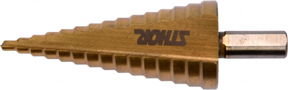 Krokový vrták 4–32 mm HSS TiN | Sthor GRD 22612Stupňovitý vrták Sthor GRD 22612 je určený na presné a efektívne vŕtanie do vysokokvalitnej nehrdzavejúcej ocele, konštrukčnej ocele, za studena valcovanej ocele, neželezných kovov, oceľových plechov a plastov. Vďaka 15 krokom a rozsahu priemerov od 4 do 32 mm je ideálny pre univerzálne použitie v dielňach, montážnych prevádzkach aj pri profesionálnych projektoch.Vrták zaručuje čisté a presné otvory bez otrepov a stabilnú prácu aj na zakrivených a hladkých povrchoch. Samostrediaca konštrukcia minimalizuje sklz a zvyšuje presnosť práce. Povlak z nitridu titánu (TiN) zlepšuje odvod tepla pri vŕtaní tvrdých materiálov, čím sa predlžuje životnosť vrtáka a zvyšuje výkon.Vyrobený je z kvalitnej rýchloreznej ocele HSS 4241, so stupňovaním po 2 mm, a vybavený trojuholníkovou stopkou, ktorá zaručuje pevné a stabilné uchytenie v skľučovadle.