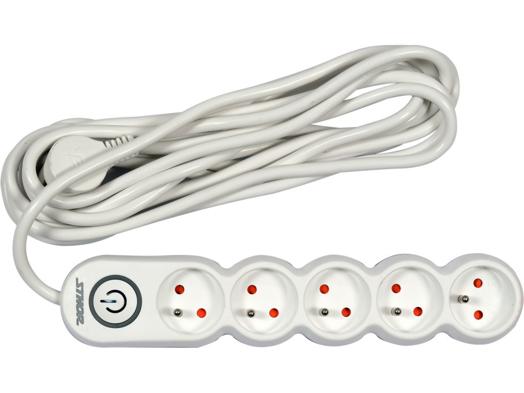 STHOR uzemnená zásuvková lišta 5M (72358) – 3 zásuvky, vypínač, detská ochrana.STHOR uzemnená zásuvková lišta 5 m (72358) je praktické a bezpečné riešenie pre rozšírenie elektrickej siete vo vašej domácnosti, kancelárii, dielni či inom pracovnom priestore. Táto zásuvková lišta ponúka 3 univerzálne zásuvky typu E, ktoré sú kompatibilné aj so zástrčkami E & F, takže je vhodná pre široké spektrum elektrických spotrebičov.Lišta je vybavená integrovaným vypínačom s podsvietením, ktorý umožňuje pohodlné ovládanie napájania bez nutnosti vytiahnuť vidlicu zo siete. Uzemnenie a detská ochrana zabezpečujú vyššiu úroveň bezpečnosti pri každodennom používaní — ideálne najmä v domácnostiach s deťmi.Kvalitný trojžilový kábel typu H05VV-F s prierezom 3G × 1,5 mm² a dĺžka 5 m poskytujú dostatočný dosah aj vo väčších miestnostiach. Zásuvková lišta podporuje napätie 230 V AC / 50 Hz pri maximálnom prúde 16 A a spoľahlivo napája vaše zariadenia – od osvetlenia a počítačov až po kuchynské spotrebiče.