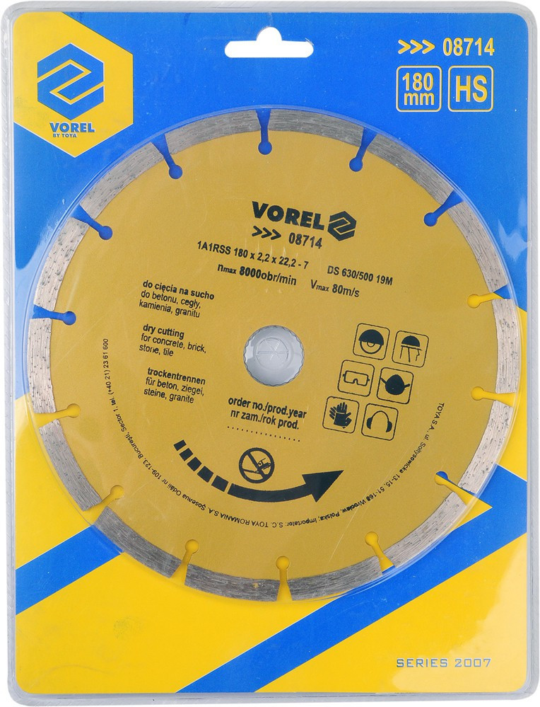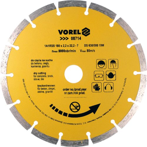 Vorel diamantová segmentovaná čepeľ 180 mm (08714) – na betón a murivoVorel diamantová segmentovaná čepeľ 180 mm (08714) je vysokokvalitný nástroj určený pre profesionálne rezanie tvrdých materiálov, ako sú betón, tehly, murivo, kamenné dlaždice alebo keramické materiály. Segmentovaný ráfik umožňuje efektívne rezanie s lepším chladením a odvodom prachu, čo predlžuje životnosť kotúča a zvyšuje presnosť rezania.Robustná kovová konštrukcia s diamantovými segmentmi poskytuje dlhodobú stabilitu a odolnosť proti opotrebovaniu. Čepeľ je vhodná pre uhlové brúsky a umožňuje prácu na suchu aj na mokro, podľa typu materiálu a potreby.
