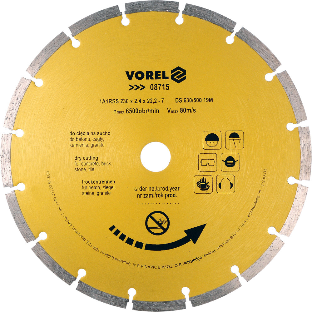 Vorel diamantová segmentovaná čepeľ 230 mm (08715) – na betón a murivoVorel diamantová segmentovaná čepeľ 230 mm (08715) je vysokokvalitný nástroj určený pre profesionálne rezanie tvrdých stavebných materiálov, ako sú betón, tehly, murivo, kamenné dlaždice alebo keramické materiály. Segmentovaný ráfik umožňuje efektívny odvod tepla a prachu, čo predlžuje životnosť kotúča a zabezpečuje presné a rýchle rezanie.Robustná kovová konštrukcia s diamantovými segmentmi poskytuje dlhodobú stabilitu a odolnosť proti opotrebovaniu. Čepeľ je určená pre uhlové brúsky a umožňuje prácu na mokro aj na sucho, v závislosti od typu materiálu a potrieb používateľa.