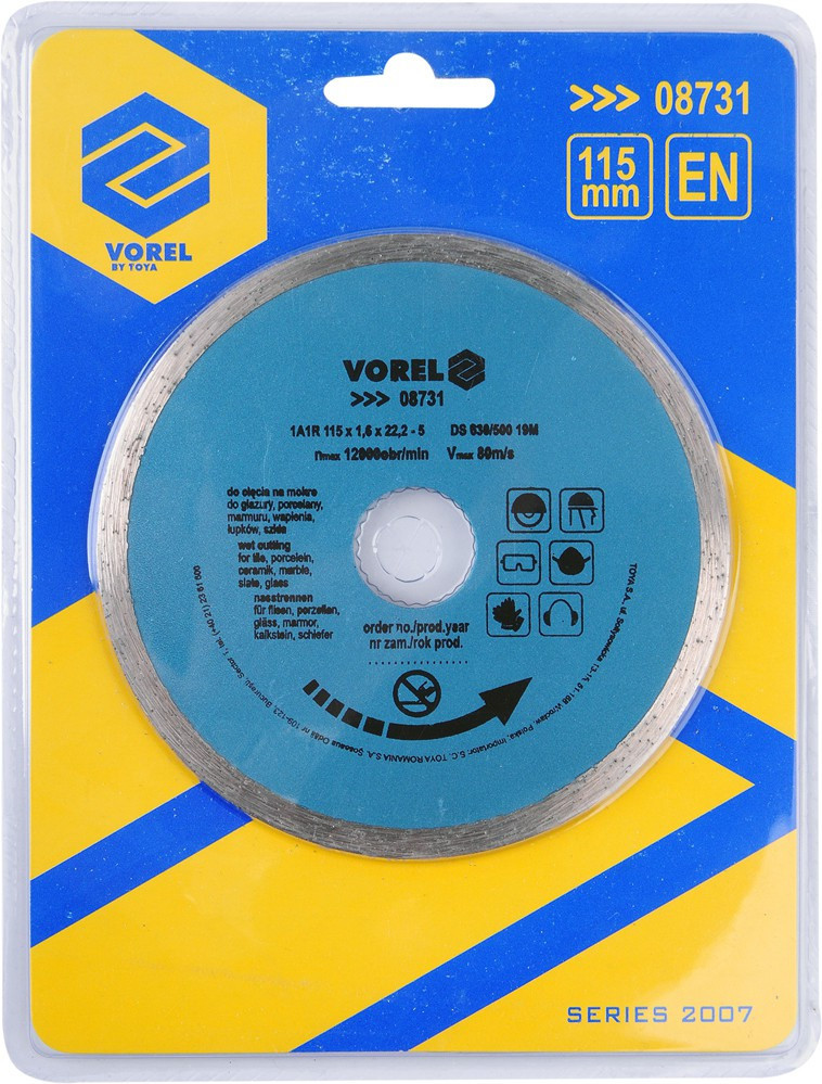 Vorel diamantový kotúč 115 mm (08731) – súvislý hrubý ozubníkVorel diamantový kotúč 115 mm (08731) s kontinuálnym hrubým ozubením je vysoko kvalitný nástroj určený pre profesionálne rezanie tvrdých materiálov, ako sú keramické dlaždice, porcelán, kameň, betón či murivo. Súvislý hrubý ráfik umožňuje presné, hladké rezanie bez triesok a prasklín, čo zaručuje čistý a bezpečný rez.Robustná konštrukcia s diamantovými segmentmi poskytuje dlhodobú odolnosť a stabilitu pri intenzívnom používaní. Kotúč je určený pre uhlové brúsky a umožňuje prácu na mokro, čím sa predlžuje životnosť a zlepšuje kvalita rezania.