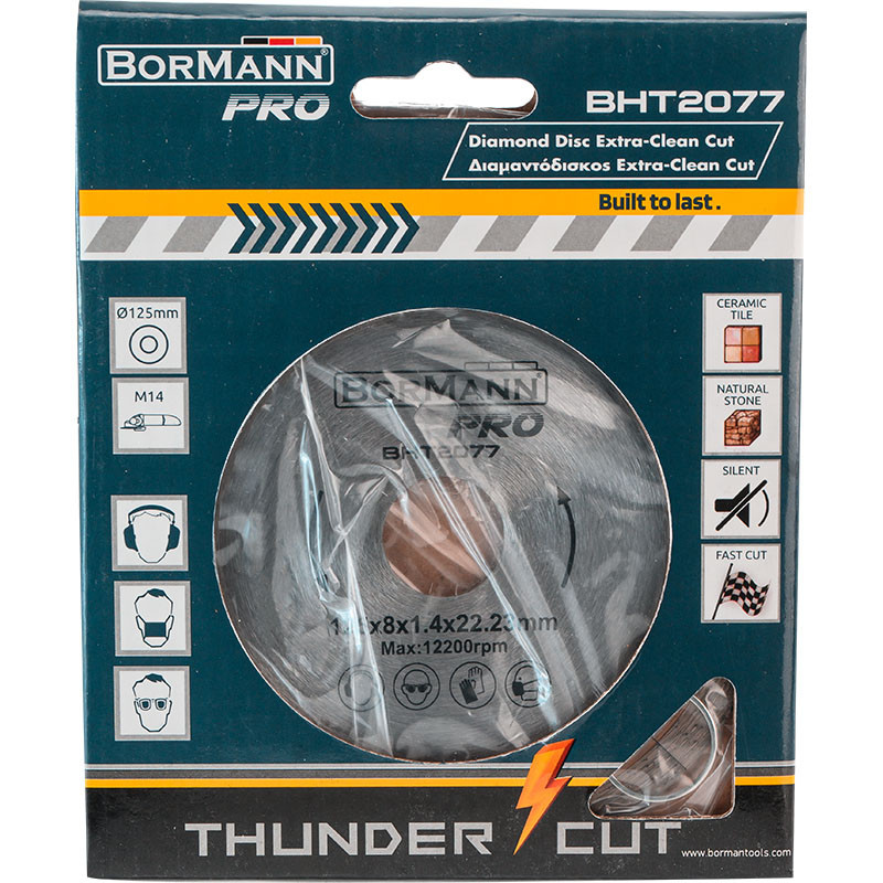 BORMANN Pro BHT2077 – Diamantový kotúč EXTRA ČISTÝ REZ Φ125×1,4×22,2 mm (výška segmentu 8 mm).Popis produktu:Diamantový kotúč BORMANN Pro BHT2077 z radu EXTRA ponúka mimoriadne čistý a presný rez pri práci s tvrdými materiálmi. Vďaka tenkému segmentu (1,4 mm) je ideálny na rezanie s minimálnym odštiepením, čo ho robí perfektným riešením pre dlažbu, keramiku, mramor a ďalšie krehké materiály. Kotúč je určený pre profesionálne použitie s uhlovými brúskami a zabezpečuje vysokú rýchlosť rezania aj dlhú životnosť vďaka kvalitným diamantovým segmentom.